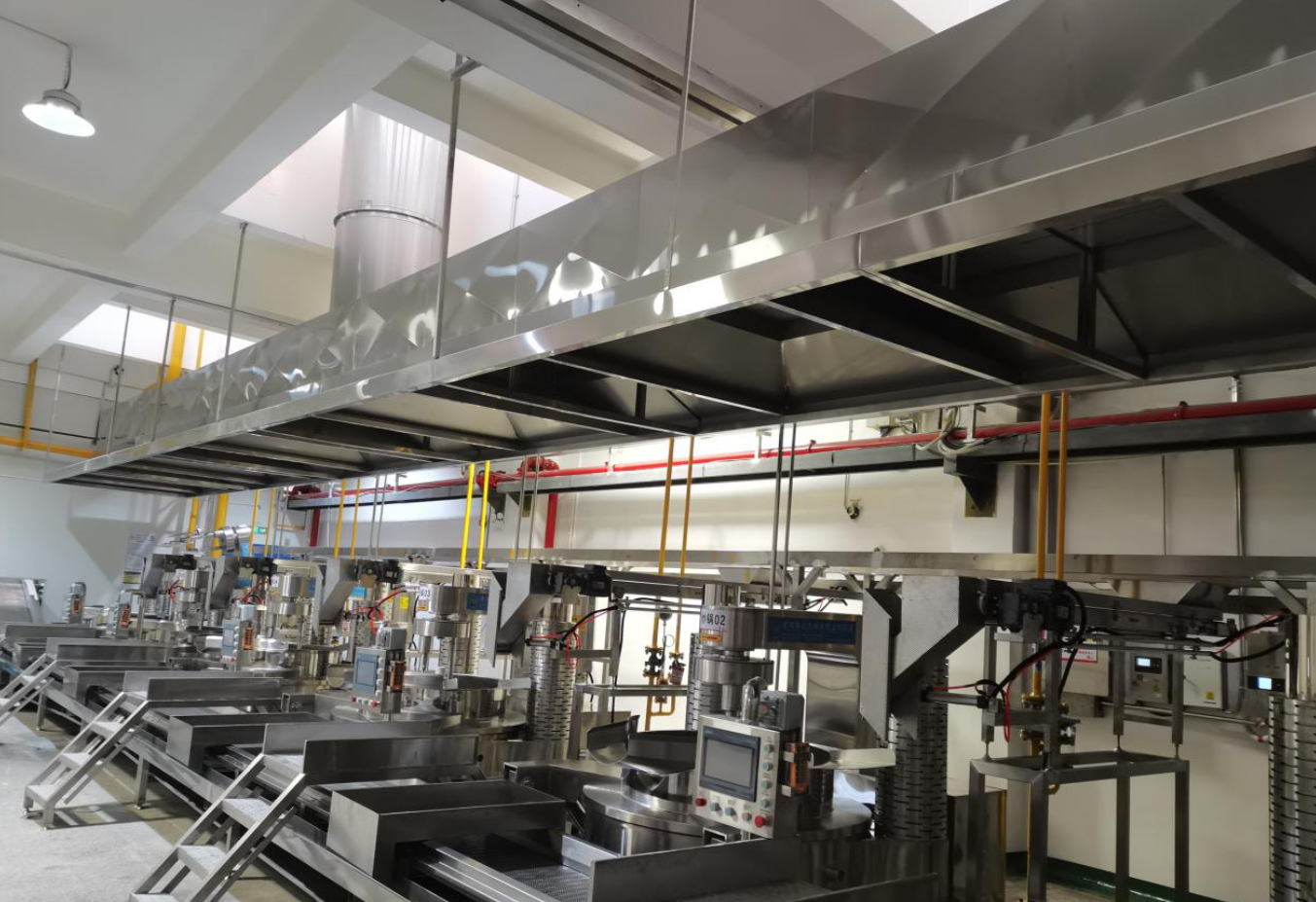 炒制车间承担火锅底料、酱料、坚果、休闲食品的炒制作业,痛点兼具油炸与蒸煮车间的双重特性。核心痛点:一是炒锅翻炒过程中持续产生高温油烟、水蒸气、调味料粉尘,混合污染物极易附着在设备与墙面,滋生细菌,造成产品交叉污染;二是车间温度常年 35℃以上,夏季炒锅周边温度突破 45℃,员工翻炒、投料、出料作业强度大,高温作业风险高;三是油烟、蒸汽、粉尘混合介质,极易造成普通净化设备堵塞,净化效果衰减快,难以满足环保排放要求;四是炒制过程频繁投料、出料,油烟易扩散,源头捕集难度大。